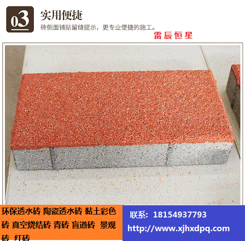 彩色透水磚:透水磚與傳統(tǒng)的彩色路面磚不同,它呈多孔、蜂窩狀結(jié)構(gòu),本身有自然積存、自然滲透、自然凈化功能。它能有效的解決城市熱島效應、除塵降噪,是海綿城市建設(shè)不可缺少的路面材料。聯(lián)系熱線18154927793李經(jīng)理或者0991-6867420.